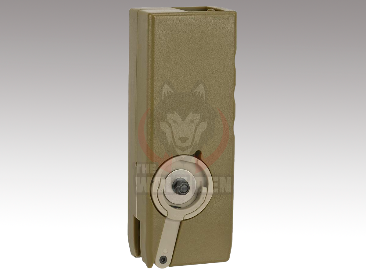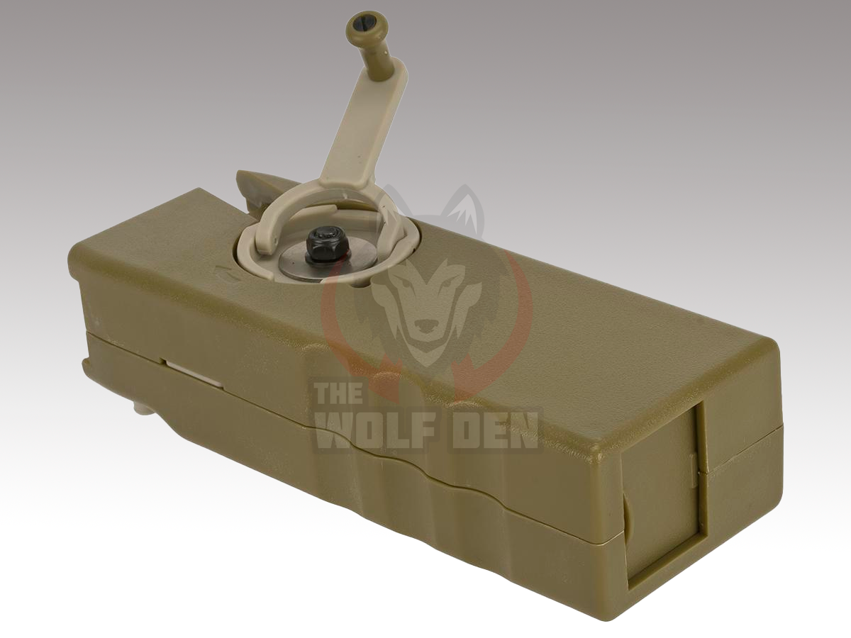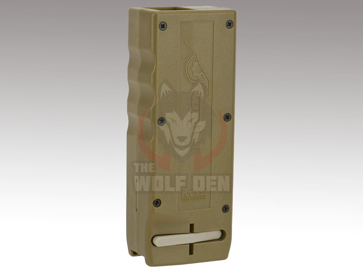 El M12 Sidewinder es una pieza esencial del equipo de todo jugador de airsoft. Con un giro rápido de la manivela, casi cualquier cargador de media capacidad para M4 se puede cargar por completo en menos de 5 segundos. El tamaño compacto del M12 Sidewinder se adapta perfectamente al interior de cualquier bolsa de cargador doble para M4 para llevarlo fácilmente al campo. La capacidad de este cargador rápido le permite cargar doce balas de media capacidad antes de tener que rellenarlo. Diseñado por un jugador de airsoft para los jugadores, el M12 Sidewinder es el último cargador rápido que necesitará.